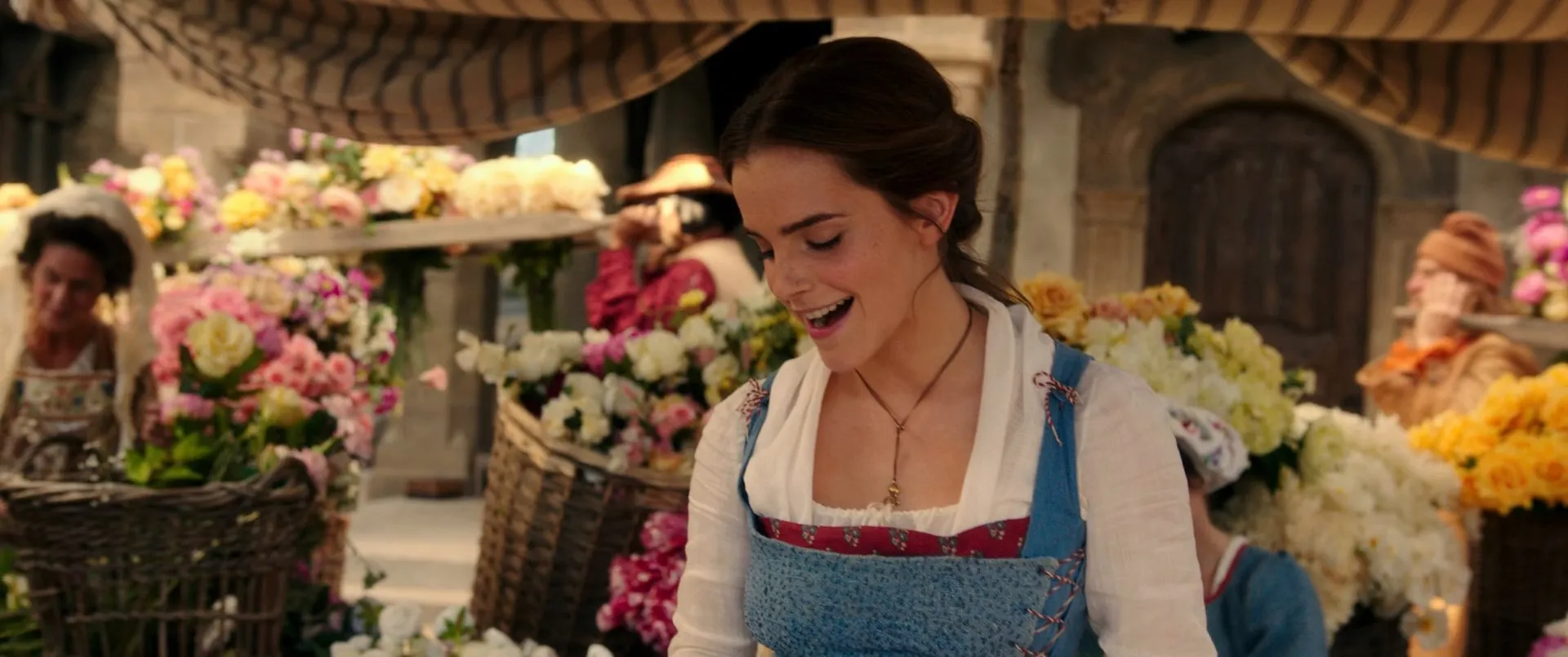 Starring: Emma Watson as Belle, Dan Stevens as Beast, Luke Evans as Gaston, Josh Gad as LeFou, Kevin Kline as Maurice, Hattie Morahan as Agathe / Enchantress, Haydn Gwynne as Clothilde, Gerard Horan as Jean the Potter, Ray Fearon as Père Robert, Ewan McGregor as Lumière, Ian McKellen as Cogsworth, Emma Thompson as Mrs. Potts, Nathan Mack as Chip, Audra McDonald as Madame Garderobe, Stanley Tucci as Maestro Cadenza, Gugu Mbatha-Raw as Plumette, Clive Rowe as Cuisinier, Thomas Padden as Chapeau, Rita Davies as Old Woman, D.J. Bailey as Vagrant, Adrian Schiller as Monsieur D'Arque, Harriet Jones as Queen, Adam Mitchell as Young Prince, Tom Turner as King, Michael Jibson as Tavern Keeper, Zoe Rainey as Belle's Mother, Daisy Duczmal as Baby Belle, Jolyon Coy as Young Maurice, Jimmy Johnston as Tom, Dean Street as Dick, Alexis Loizon as Stanley, Sophie Reid as Village Lass, Rafaëlle Cohen as Village Lass, Carla Nella as Village Lass, Obioma Ugoala as Flirtatious Farmer, Lynne Wilmot as Barmaid, Jane Fowler as Pretty Female Fishmonger, Alison Harding as Head Washer, Chris Andrew Mellon as Nasty Headmaster, Jemma Alexander as Housewife, Sandy Strallen as Cobbler, Dale Branston as Baker, Daniel Ioannou as Barber, Peter Challis as Butcher, Wendy Baldock as Washer Woman, Norma Atallah as Washer Woman, Leo Andrew as Apothecary, Steven Butler as Cheese Maker, Sharon Gomez as Cheese Maker, Jacqui Jameson as Cheese Maker, Vivien Parry as Village Lass's Mother, Simone Sault as Wood Carrier, Beth Willetts as Jam Seller, Mandy Montanez as Bread Buyer, Tom Oakley as Fishmonger, William Bozier as Stable Boy, Jak Allen-Anderson as Apothecary's Patient, Phil Grannel as Fiddler, Freddie August as Fiddler, Nicola Keen as Female Villager / Celebration Woman, Ebony Molina as Female Villager / Celebration Woman, Alison Jenkins as Female Villager / Celebration Woman, Ellen O'Grady as Female Villager, Dawn Buckland as Female Villager, Rebecca Mckinnis as Female Villager, Jody Hall as Male Villager, Ben Fox as Male Villager, Nathan Vaughan Harris as Male Villager, Tim Stanley as Male Villager, Ben Clare as Male Villager, Marina Abdeen as Debutante, Danielle Acors as Debutante, Hayley Ainsley as Debutante, Rhianne Alleyn as Debutante, Gabby Antrobus as Debutante, Sophie Atkins as Debutante, Koko Basigara as Debutante, Holly Bluett as Debutante, Daisy Boyles as Debutante, Ava Brennan as Debutante, Sophia Brown as Debutante, Sophie Carmen-Jones as Debutante, Cassie Clare as Debutante, Tanya Cumberland as Debutante, Natalie Davis as Debutante, Paige Drury-Lawrence as Debutante, Stephanie Elstob as Debutante, Cordelia Farnworth as Debutante, Cj Field as Debutante, Lily Frazer as Debutante, Lucy Alexa Gilbert as Debutante, Helen Gulstan as Debutante, Selina Hamilton as Debutante, Leah Hill as Debutante, Abigayle Honeywill as Debutante, Chelsea Inez as Debutante, Blythe Jandoo as Debutante, Shireen Jathoonia as Debutante, Billie Kay-Piper as Debutante, Hannah Kenna-Thomas as Debutante, Ella Kora as Debutante, Jennifer Leung as Debutante, Emily Loumba as Debutante, Cassie Macmillian as Debutante, Fiona McDonald as Debutante, Samira Mighty as Debutante, Sonoya Mizuno as Debutante, Anna Momcilovic as Debutante, Nicola Mooi as Debutante, Nicole O'Neill as Debutante, Abiona Omonua as Debutante, Jazz Peters as Debutante, Courtney Pruce as Debutante, Kayla Radam as Debutante, Katie Singh as Debutante, Lucy St Louis as Debutante, Ruth Steele as Debutante, Jasmine Takacs as Debutante, Naomi Weijand as Debutante, Leah West as Debutante, Skye Lucia Degruttola as Washer Girl, Timia Julien-Box as Little Girl, Adelaide Morgan as Little Girl, Gemma Fray as Little Girl, Lara Decaro as Little Girl, Max Brophy as School Boy, Samuel Brown as School Boy, Daniel Daszek-Green as School Boy, Freddie Hunter as School Boy, Joey Brown as School Boy, Tom Burgering as School Boy, Nate Leung as School Boy, Kai Gordon as School Boy, Oscar Francisco as School Boy, Harry Marcus as School Boy, Johanna Smitz as Village Woman (uncredited)
